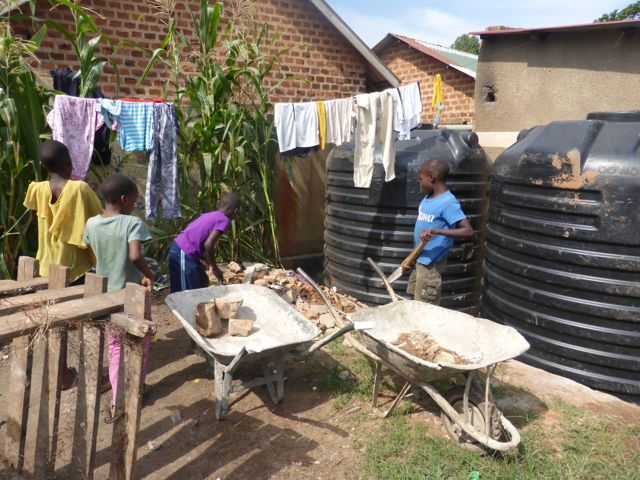 Endlich ist das Müllproblem gelöst. Endlich hat Ronnie eine Firma beauftragt, die den Müll wöchentlich abholt. Vor lauter Freude bin ich sofort losgestiefelt und habe zwei große Kunststofftonnen gekauft, die in Zukunft als Müllbehälter dienen sollen. Ist das nicht ein Erfolg? Meine zugegeben übertriebene Meldung an Ronnie (der seit einer guten Woche in Norduganda weilt), wir würden jetzt bald in Müll ersticken hat gewirkt. Die unverblümte Drohung, dass ich keine Minute mehr in Peace Africa bleibe, wenn wieder Müll verbrannt wird, wohl auch. Egal: Der Zweck heiligt die Mittel und ich jubiliere. Heute Morgen also kam die Müllabfuhr und lud wohl den gesamten Laster voll, denn als ich nach Peace Africa kam, konnte man endlich wieder Gras sehen. Allerdings konnte man auch den ganzen Verhau sehen, der hier geblieben war. Also war heute großes Aufräumen angesagt: Ziegel aufschichten, Bruchziegel und Erdhaufen raus ins den angrenzende Sumpfland, Kompostcontainer zerlegen, das Brennholz aufschlichten und so weiter. Interessant ist immer wieder, dass die volljährigen Kinder keinen Finger rühren, sondern höchstens die kleineren anhalten zu arbeiten. Ein bisschen verarscht komme ich mir da schon oft vor, wenn Madame oder Monsieur dastehen, zuschauen und ab und zu einen klugen Auftrag auf Luganda loslassen, während ich klaube, fege, schrubbe und mich dabei so richtig dreckig mache. Naja, zumindest die Kleinen leisten mir dabei gute Gesellschaft.